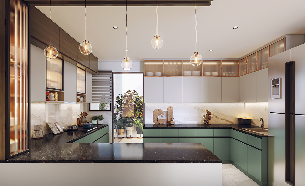 Equipment: Washing machine, refrigerator, dishwasher, microwave, chimney & hob and geyser.